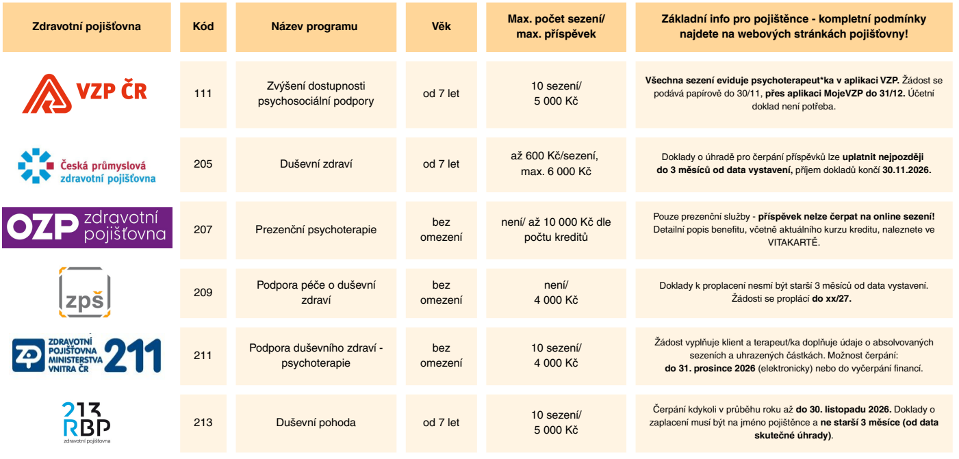 Na péči lze čerpat příspěvky z preventivních programů těchto zdravotních pojišťoven: VZP (111), ČPZP (205), OZP (207), ZPŠ (209), ZPMV (211), RBP (213). Je vhodné předložit kartičku pojišťovny dítěte, příp. zákonného zástupce. Bližší informace naleznete na stránkách ZP.